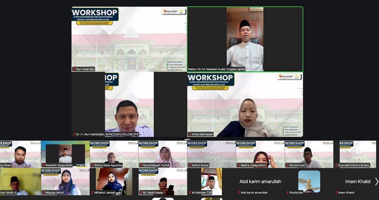 “Membangun Kurikulum Unggul, Menguatkan Mutu Pembelajaran.” Kuala Tungkal, 3 Desember 2025 — Rektor Institut Agama Islam (IAI) An-Nadwah Kuala Tungkal memberikan arahan sekaligus membuka secara resmi kegiatan Workshop Kurikulum Berbasis OBE (Outcome Based Education) serta Integrasi Bahan Ajar menjadi Buku Ajar yang diselenggarakan bekerja sama dengan Penerbit Deepublish. Kegiatan ini berlangsung secara daring melalui platform Zoom Meeting dan diikuti oleh para dosen dari berbagai program studi di lingkungan IAI An-Nadwah.